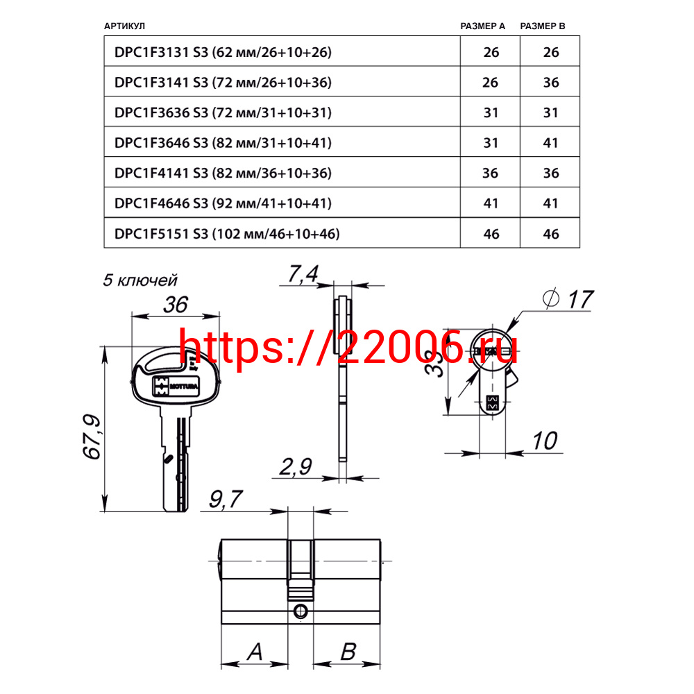 - Цилиндровый механизм Mottura (Моттура) с вертушкой DPC1F3131 S3 (62 мм/26+10+26) САТИН.НИКЕЛЬ, 5+1 кл. в Москве недорого