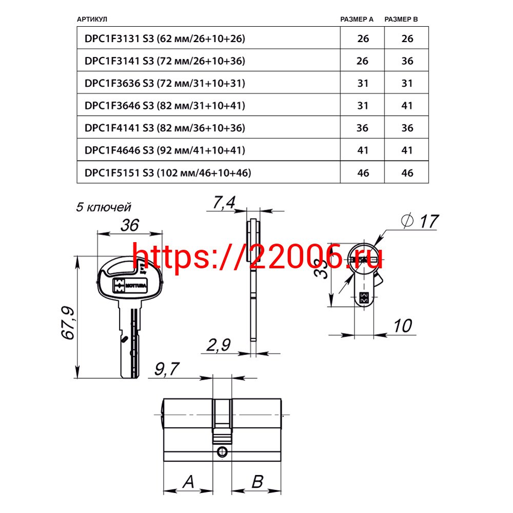 - Цилиндровый механизм Mottura (Моттура) с вертушкой DPC1F4141 S3 (82 мм/36+10+36) САТИН.НИКЕЛЬ, 5+1 кл. в Москве недорого
