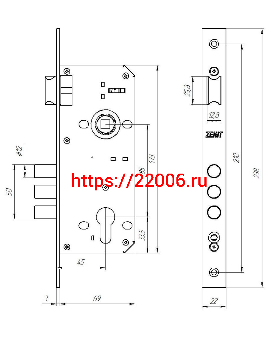 - Замок Zenit (Зенит) врезной цилиндровый с защёлкой в комплекте с ручкой ЗВ4-85.3 (медь), 5 кл. в Москве недорого