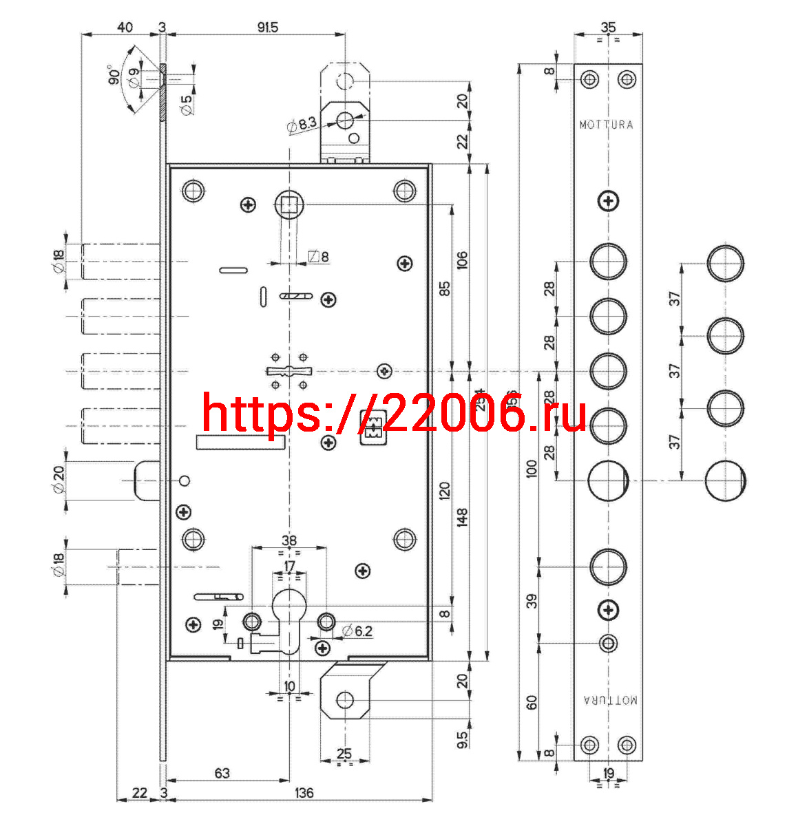 - Замок Mottura (Моттура) врезной двухсистемный 54.797-S (левый) (без накладок), ключ 60 мм в Москве недорого