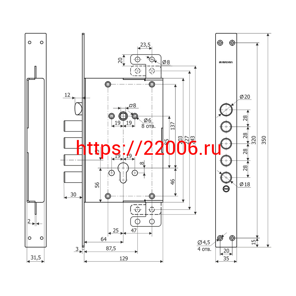 - Корпус Guardian (Гардиан) врезного замка с защёлкой ЗВ 72.16 Т с тягами. /128:4140/ в Москве недорого