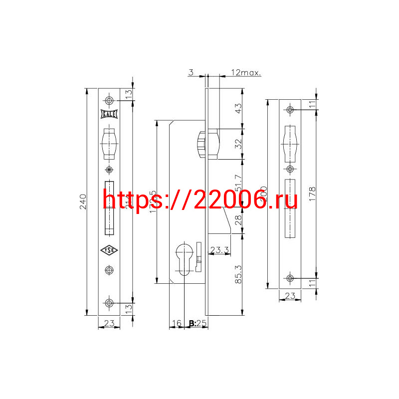 - Корпус Kale kilit (Кале килит) узкопрофильного замка с роликовой защёлкой 255 (25 mm) w/b (никель) в Москве недорого